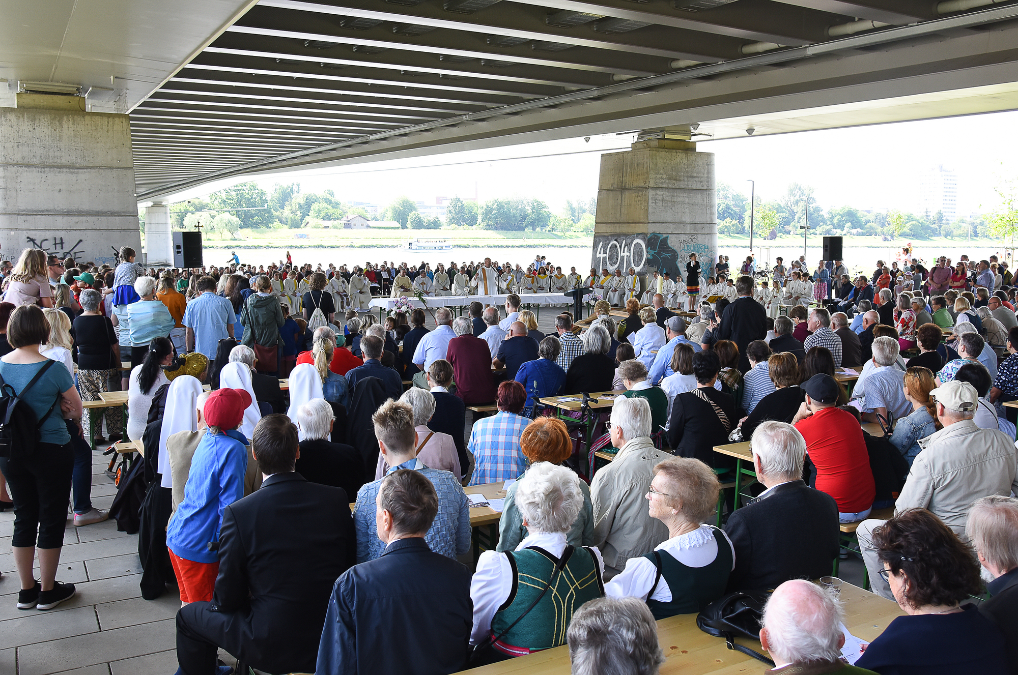 Das Gründungsfest der Pfarre Urfahr St. Junia fand am 4. Juni 2023 im öffentlichen Raum im Schutz der neuen Eisenbahnbrücke an der Donau statt. Wie eine moderne Kathedrale spannt sich die Brücke über die 800 Feiernden.