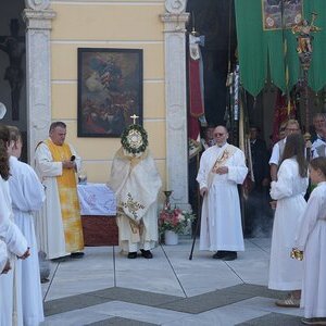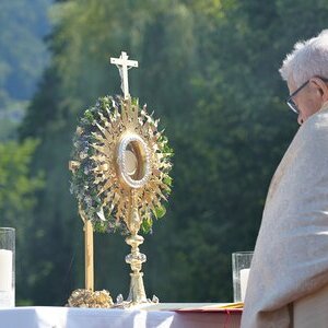 Bei der Prozession wird dann die Monstranz vom Priester unter dem Himmel getragen. Eine Monstranz ist ein kostbares, mit Gold gestaltetes liturgisches Schaugefäß mit einem Fensterbereich. In diesem wird eine konsekrierte Hostie, das Allerheiligste, zur Verehrung und Anbetung feierlich gezeigt. In unserer Pfarre wird die Monstranz zu Fronleichnam noch mit einem Kranz aus Blumen schön geschmückt.